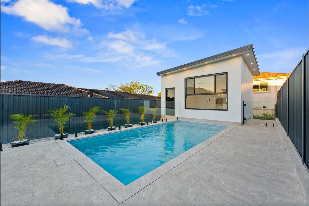 An enclosed sunroom with a second kitchen opens to a low-maintenance yard and sparkling in-ground poolperfect for entertaining. The separate studio at the rear is ideal for guests, teens, or extra income.